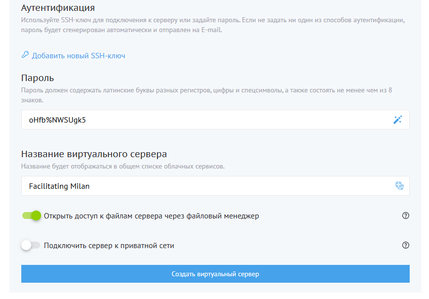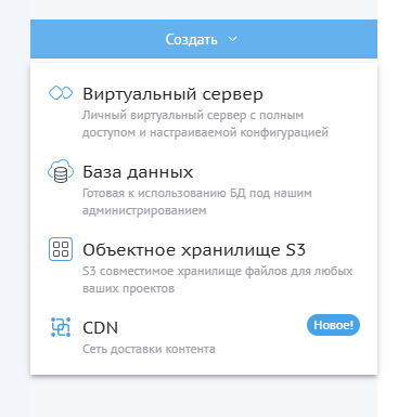 В кабинете жмем «Создать» → «Виртуальный сервер».